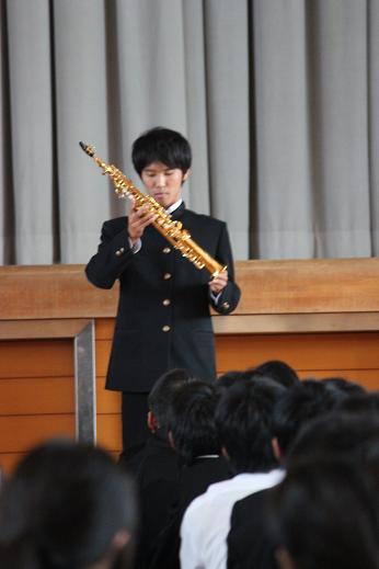 試験終了後の全校集会で小村 信校長先生のお話しの後、サックスパート5名によって